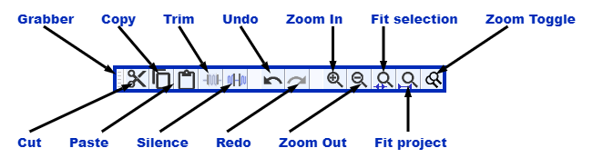The Edit Toolbar is a bit more complex, consisting of 13 different utilities. The first is the Grabber, which simply drags the entire toolbar around, allowing it to be placed in different areas. The second is the Cut button. It allows the user to remove a selected piece of audio from the recording. When this is done, any remaining audio is automatically shifted to the left. Next is the Copy and Paste buttons, which are pretty self-explanatory.